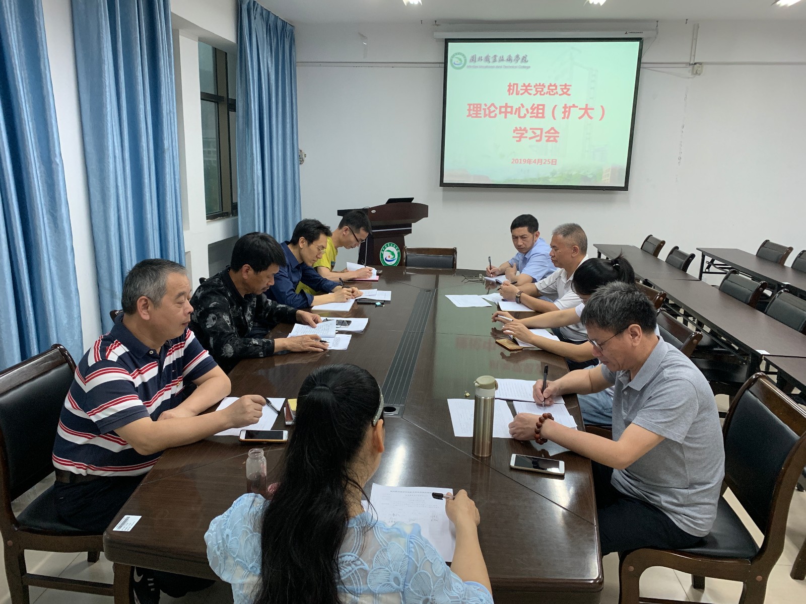 2019年4月25日上午,学院机关党总支在行政楼五楼会议室召开理论中心组第三次(扩大)学习会,机关党总支班子成员、各支部书记和支部委员参加了会议。会议由机关党总支叶常明书记主持。会上,叶常明书记传达了学院2019年党建工作会议精神、学习传达了全省教育大会和高校党建工作会议精神,并组织开展形式主义、官僚主义突出问题集中整治专题学习讨论。与会委员结合自身岗位和工作实际,围绕主题依次发言,每位委员查找了在形式主义、官僚主义方面存在的突出问题、剖析了原因、提出了整改措施和今后努力的方向。