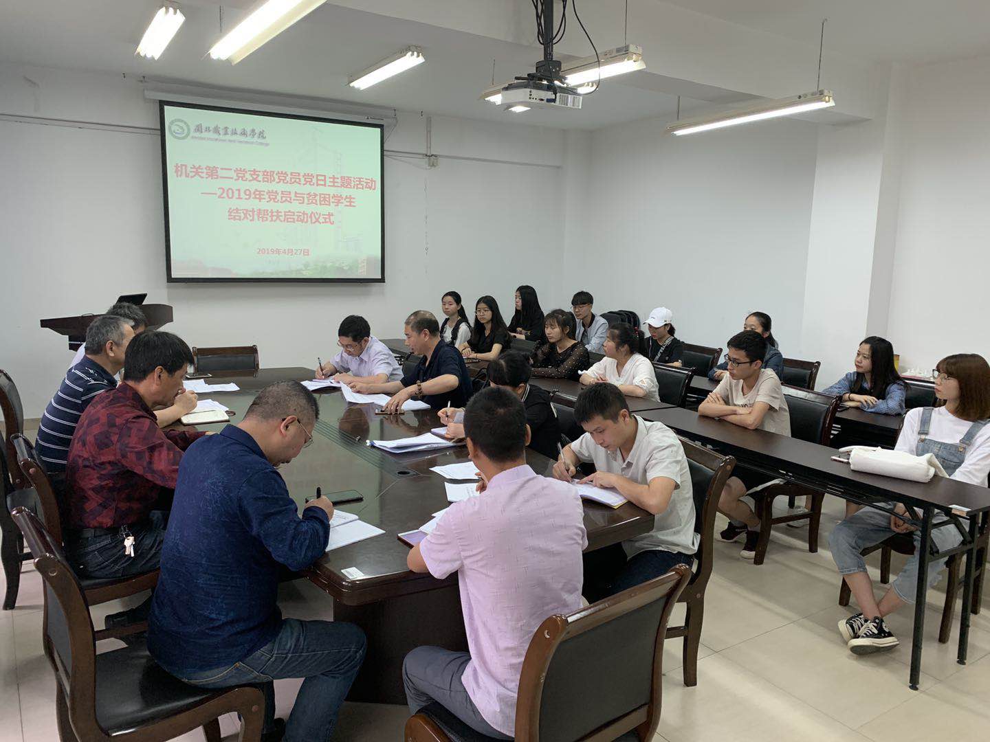 2019年4月27日下午,学院机关第二支部在行政楼五楼会议室,组织召开2019年开展党员与贫困学生结对帮扶启动仪式会议。机关第二支部全体党员及结对帮扶学生参加了会议。会议由机关第二支部书记吴兴旺同志主持。