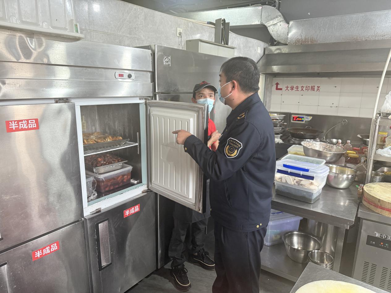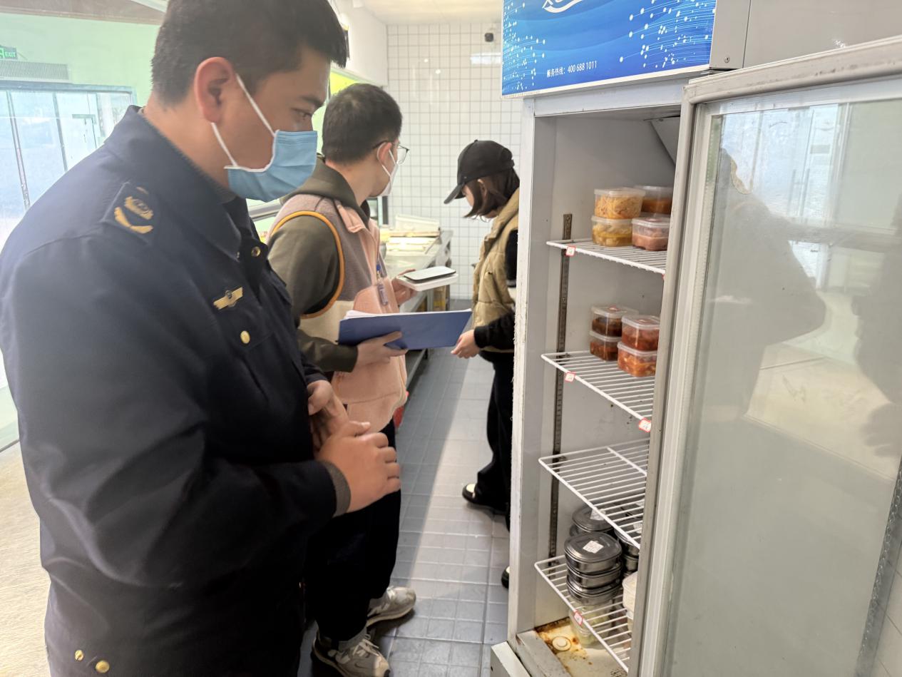 2025年2月17日下午,夏道市场监督管理所周涛所长一行4人到我院开展2025年春季学期期初食品安全检查。详细查看了学院食堂从业人员健康证、食品安全总监、食品安全员任职资格、食品安全风险管控清单。对食堂后厨的食品原材料采购、粗加工、餐饮具清洗消毒保洁、食材烹饪、食品留样等操作环节的食品安全工作进行指导。后勤管理处黄长松处长等相关工作人员全程陪同检查。