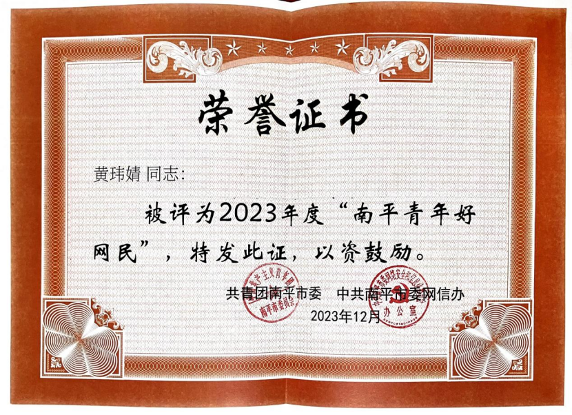 喜报|我院青年教师黄玮婧获评2023年度“南平青年好网民”