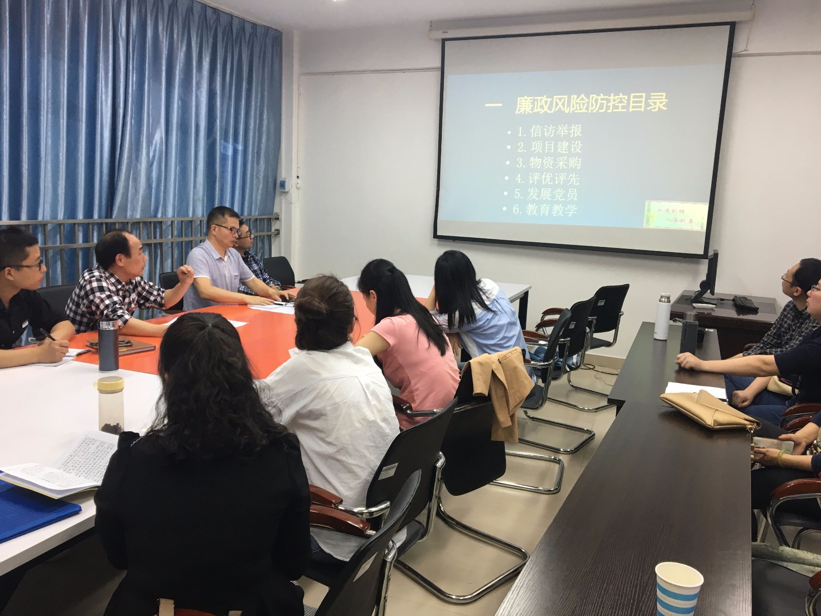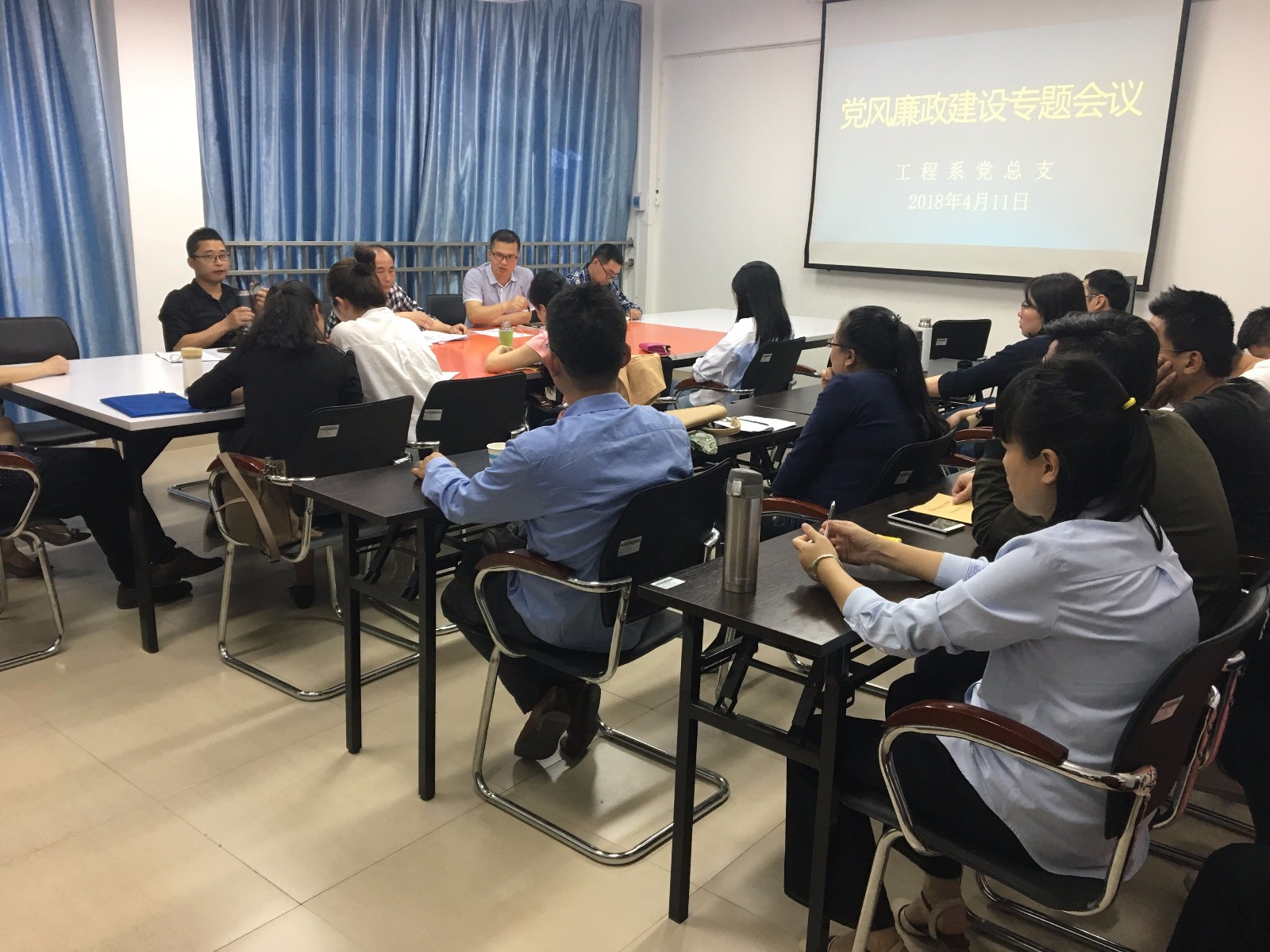 4月11日下午,工程系党总支召开了党风廉政建设专题会议,全体教职工参加了会议。会上,系总支副书记作了“清正在德、廉洁在志”党风廉政建设专题报告,首先,他传达了我院2018年全面从严治党工作会议的主要精神;其次,他对系总支制定的“信访举报、项目建设、物资采购、评优评先、发展党员、教育教学”等六个廉政风险点的风险防控措施进行了解读说明,要求大家切实提高思想觉悟,提高拒腐防变能力,筑牢思想道德防线。会议最后强调:大家要结合十九大会议精神的学习宣传贯彻,进一步加强廉洁自律的自觉性,加强师德师风建设,做好示范、当好表率,在师生中树立良好的形象,振奋精神,真抓实干,为二轮评估的整改工作多做贡献。