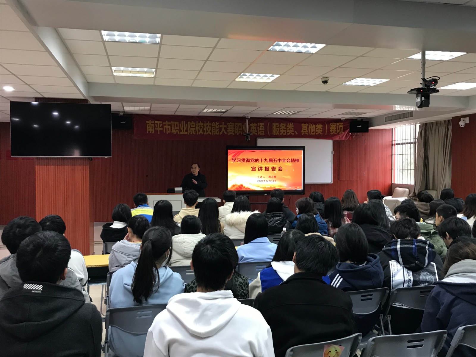 12月16日下午,信息系和食品系联合党总支召开学习贯彻党的十九届五中全会精神第二场宣讲报告会,党总支常务副书记郑启阶为参会的近百名大二学生代表进行了宣讲。