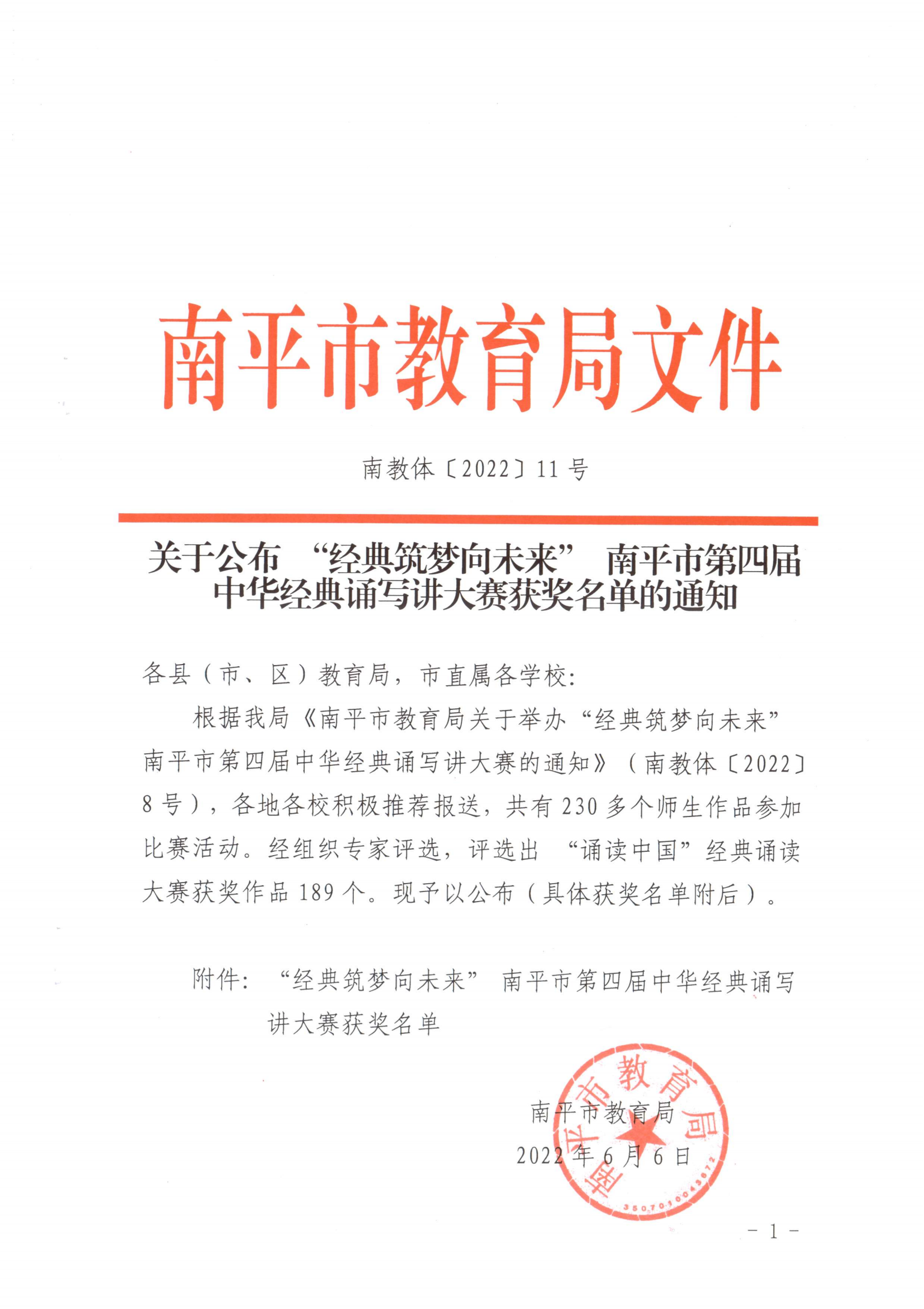6月6日🥬,我校选送作品在“经典筑梦向未来”南平市第四届中华经典诵写讲大赛中获佳绩: