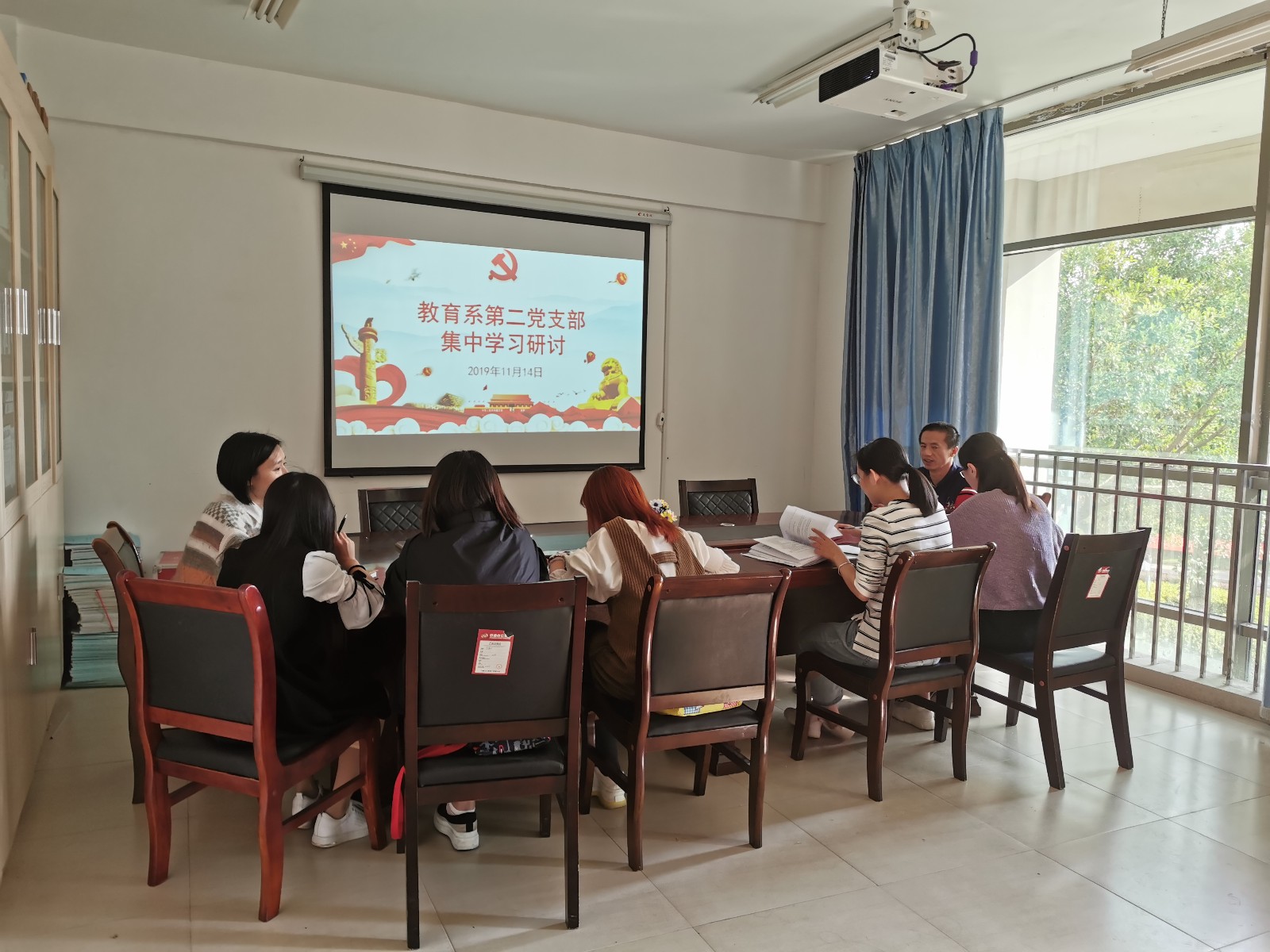 2019年11月14日下午👋🏽,教育系第二党支部在行政楼204召开集中学习研讨会🧑🏻‍🍳。会议由支部书记张灵暄同志主持,支部全体党员参加了此次会议。