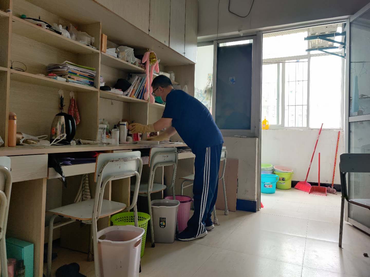 有的老师为了不影响白天的工作♏️,天刚刚亮就起床为同学们清扫擦洗宿舍;有的老师忙到中午忘记了吃饭依然开心地拖着地板,就像为他乡求学的自家孩子整理行囊;有的抱着即将霉变的被子、草席疾步冲到天台,就怕太阳被云遮盖。老师们辛勤地耕耘者、爱护着📬,始终把学生的健康摆在首位。