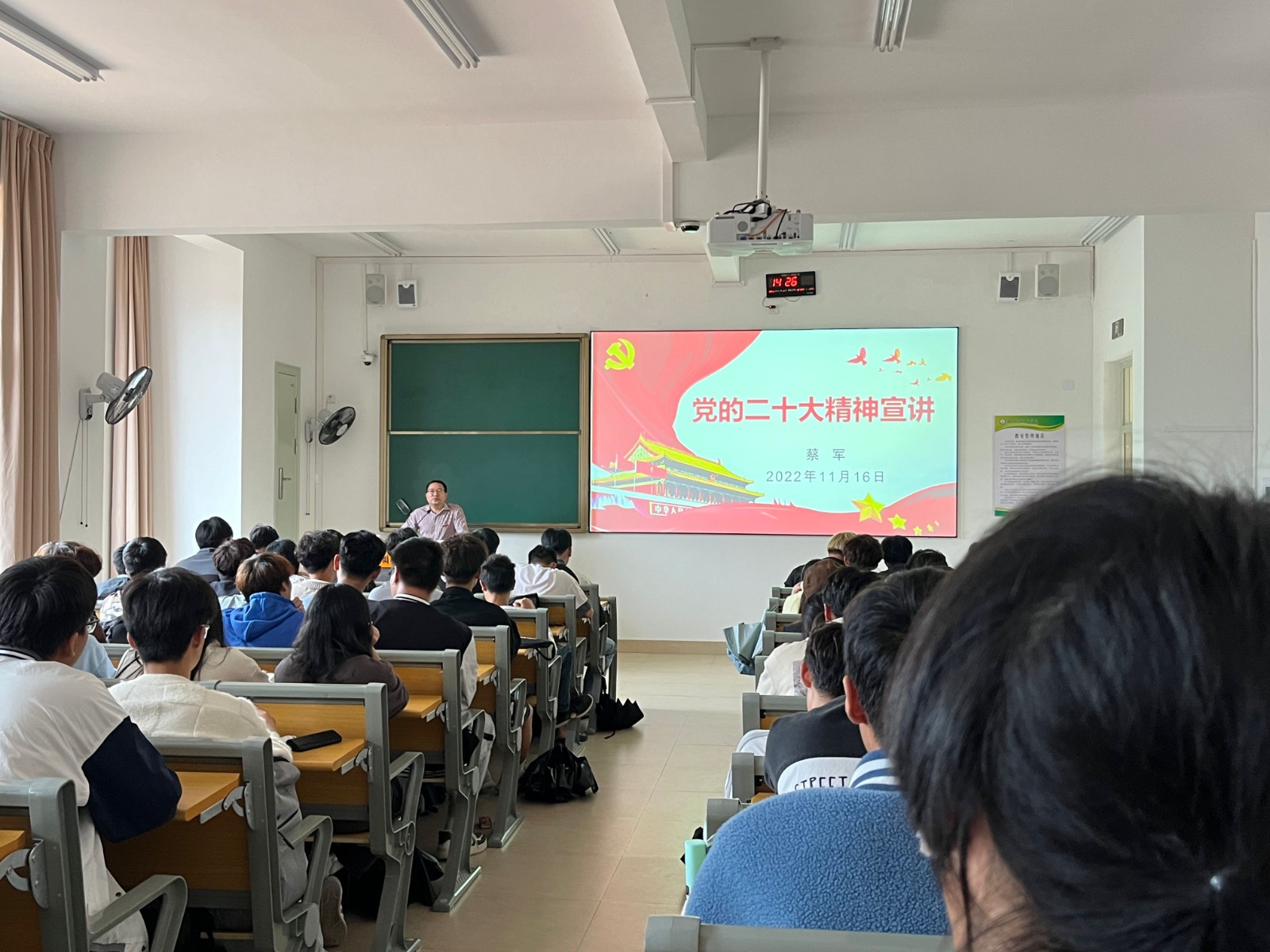 院党委委员组织部(统战部)部长蔡军为信息系和食品系学生宣讲党的二十大精神