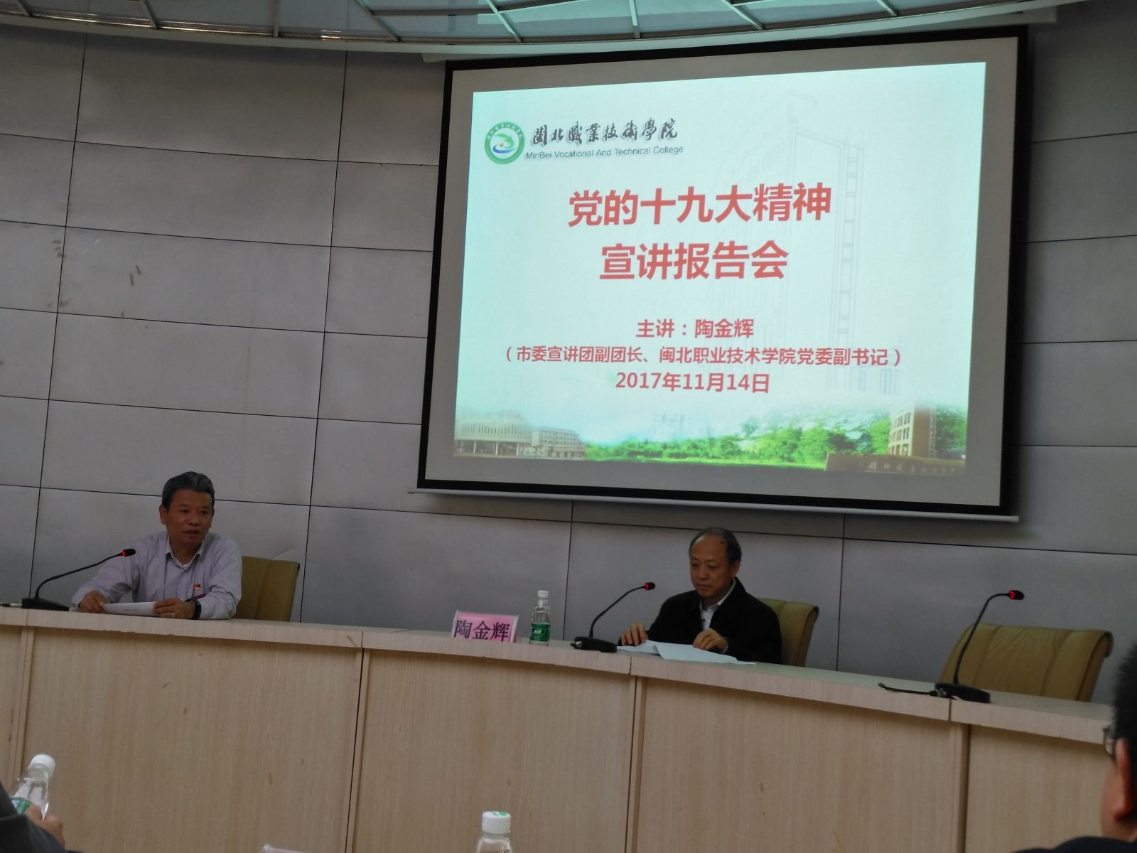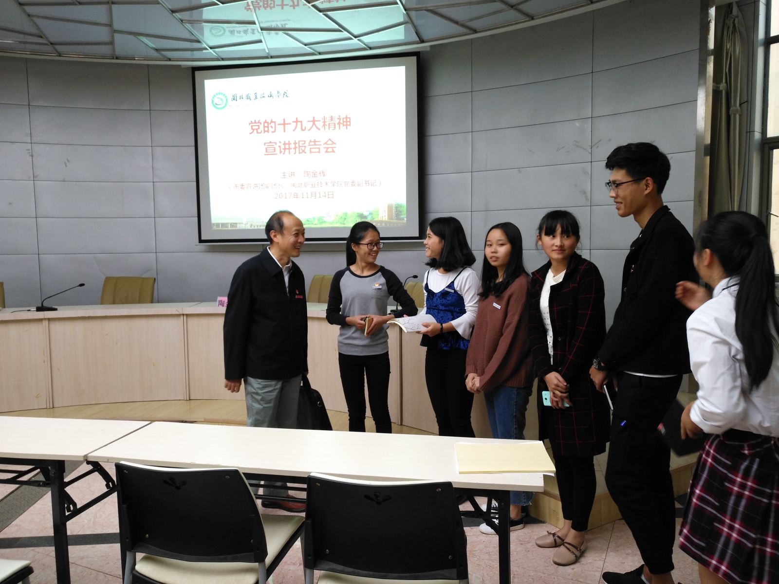 2017年11月14日下午🂠,我院党的十九大精神宣讲报告会在行政办公楼一楼报告厅举行🦸🏽♂️,南平市市委宣讲团副团长🤹🏿、院党委副书记陶金辉同志作了宣讲报告,院中层以上党员干部、各总支委员、支部委员🪛、学生代表等70余人参加了报告会,我系领导主任、总支副书记张金良🤛🏽🧔♂️,系常务副书记郑启阶等出席了会议。陶副书记从“关于十九大的主题🧙🏽♀️🐕、成果”👨🏻🦳、“关于习近平新时代中国特色社会主义思想”等八个方面进行了宣讲。宣讲全面、到位😤🫄,切合实际,全体与会人员对党的十九大精神有了更深入的认识。报告会结束后➜,陶副书记现场接受了学生的采访,对学生提出的问题进行了一一解答🕵🏼♂️。
