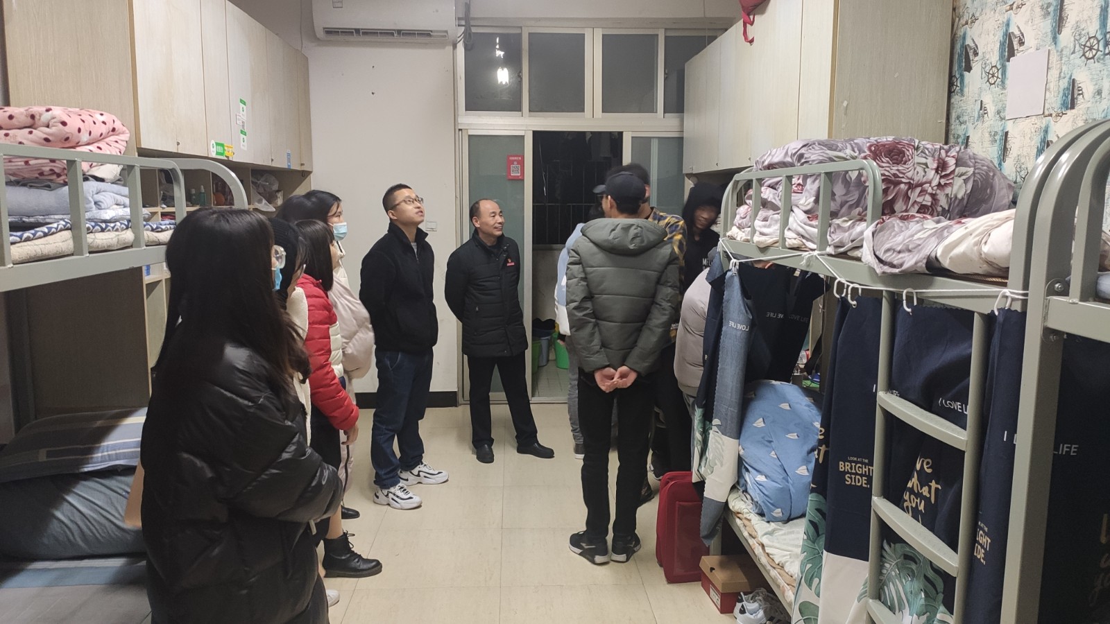 为营造良好的宿舍环境,促进寝室文化建设,保障学生人身安全。12月15日晚,郑启阶副书记、胡建辉科长及全体辅导员走访我系学生宿舍。