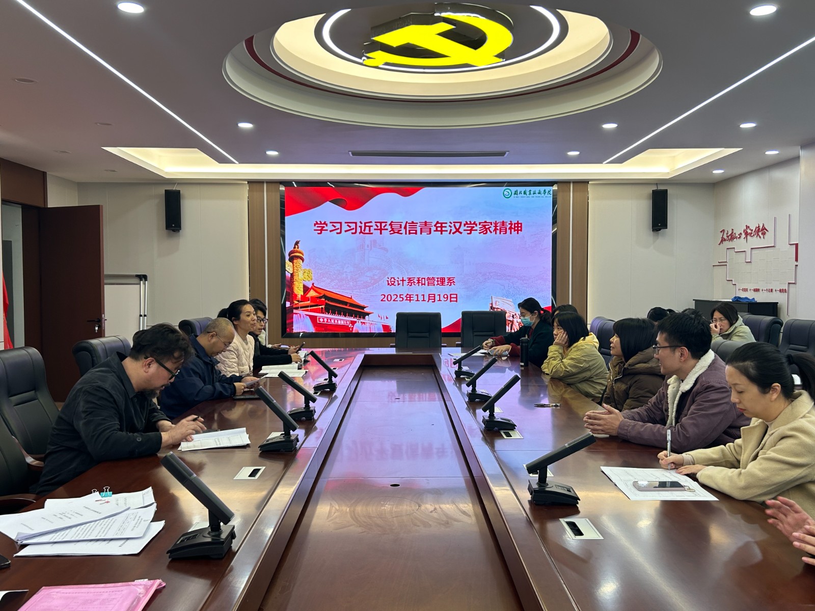 2025年11月19日,设计系与管理系在宝龙楼党员会议室开展学习会,会议由系主任白雁飞主持,两系全体教职工参加。