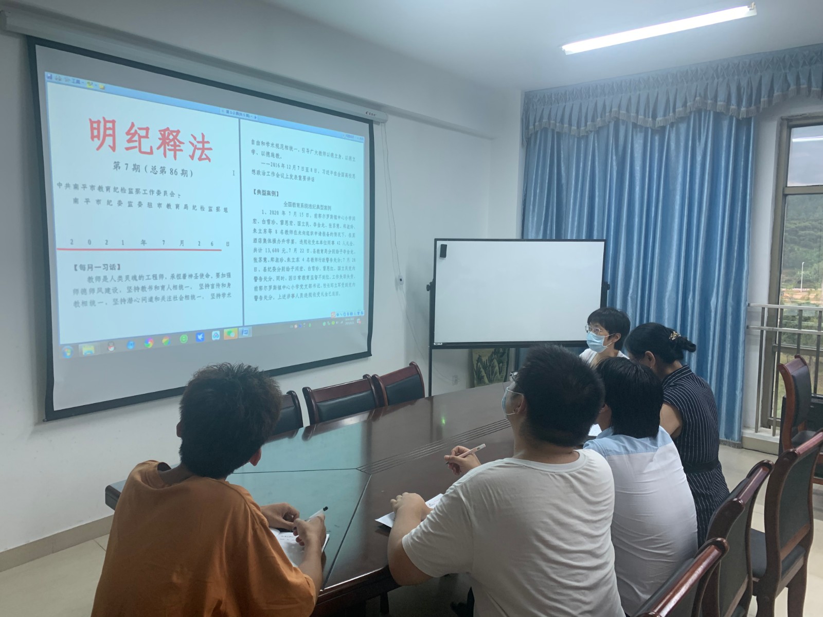 詹永珍处长组织处室工作人员学习中央纪委国家监委公开通报十起违反中央八项规定精神典型问题及南平市纪委教育工委明纪释法 第7期(总第86期)中教育、体育系统违纪违法典型案例,要求处室工作人员要从身边典型案例中吸取教训、引以为戒,绷紧纪律之弦,守住行为底线,不要触犯纪律的红线。