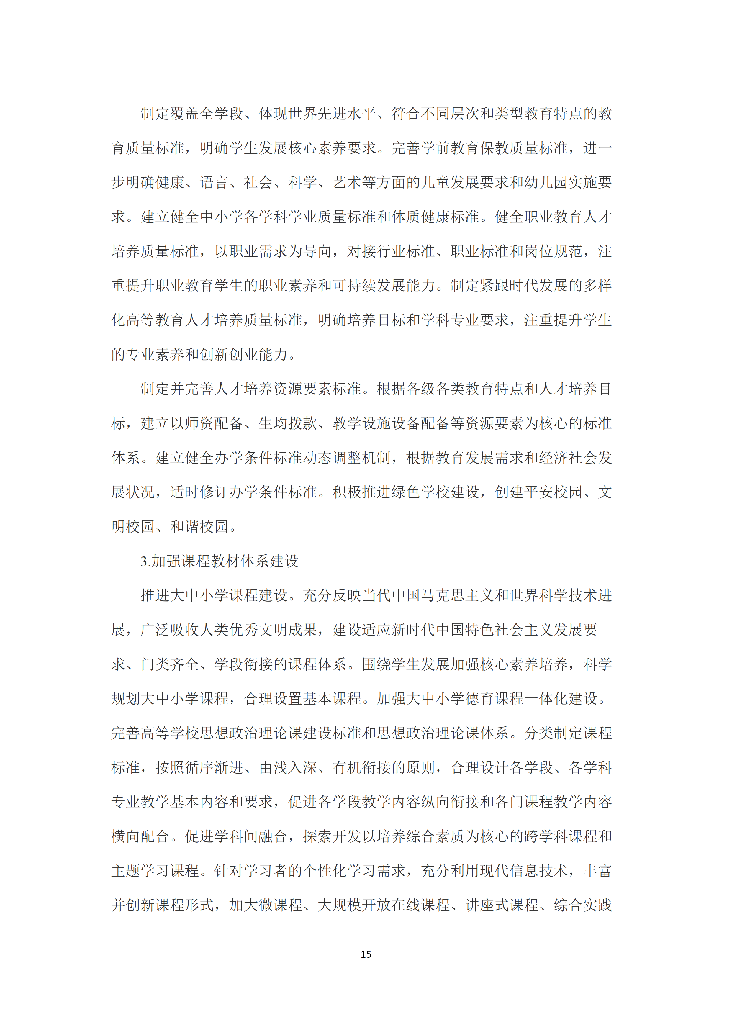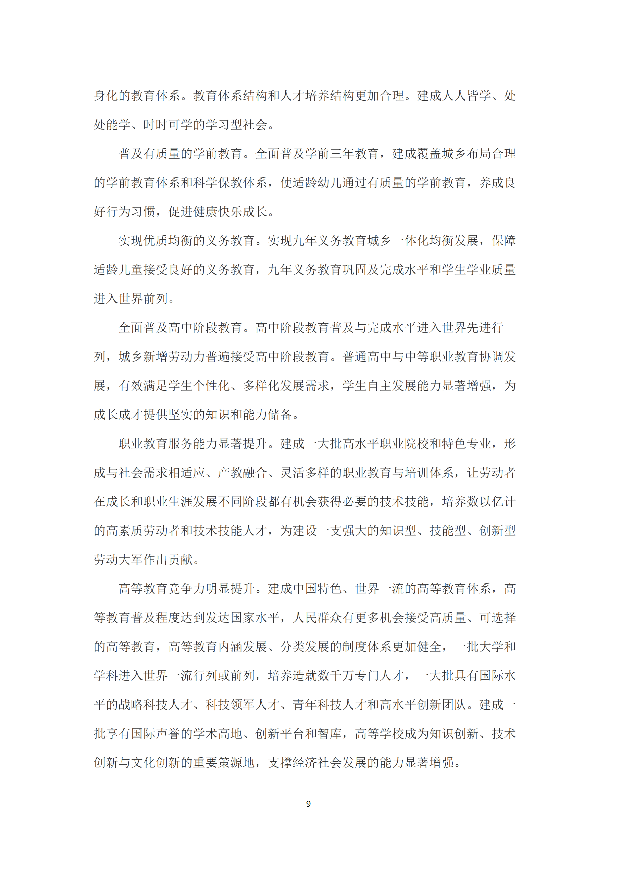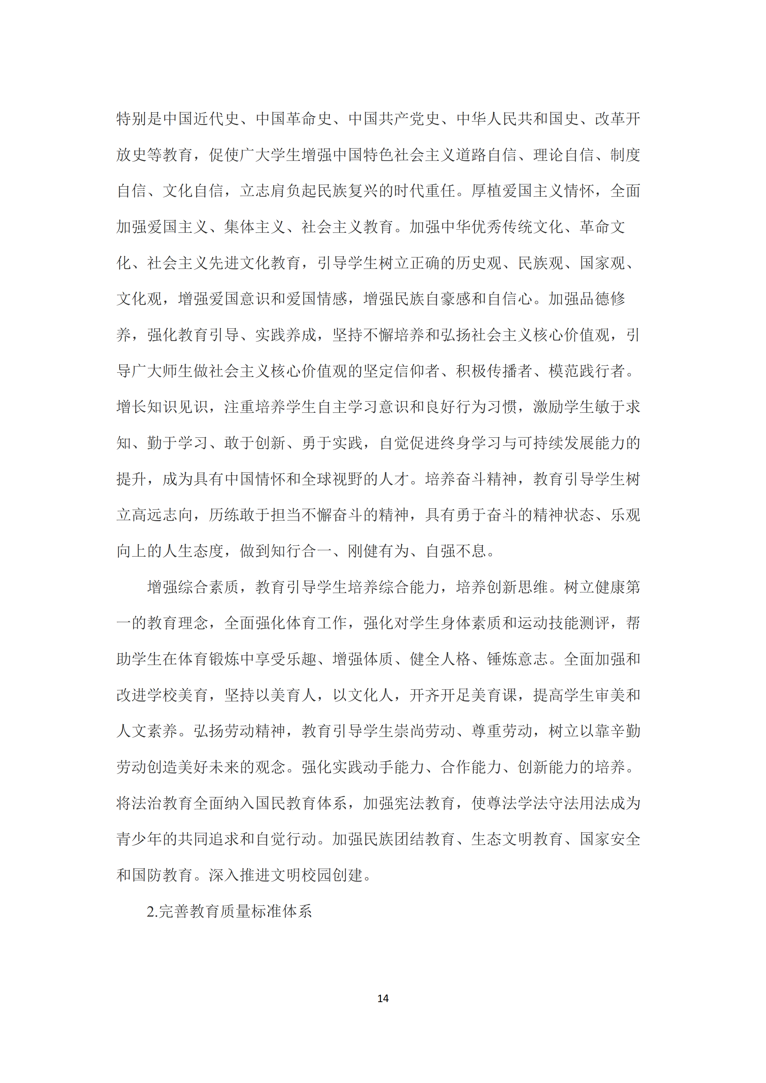 二是发展中国特色世界先进水平的优质教育🏂🏽。全面落实立德树人根本任务,广泛开展理想信念教育,厚植爱国主义情怀,加强品德修养,增长知识见识🐔,培养奋斗精神,不断提高学生思想水平⚅、政治觉悟、道德品质、文化素养💷。增强综合素质,树立健康第一的教育理念🈁,全面强化学校体育工作,全面加强和改进学校美育,弘扬劳动精神,强化实践动手能力、合作能力🙏🏼、创新能力的培养🧎🏻♀️。完善教育质量标准体系🙍🏼♂️,制定覆盖全学段、体现世界先进水平🎻、符合不同层次类型教育特点的教育质量标准🩷,明确学生发展核心素养要求👩🏼💼。完善学前教育保教质量标准。建立健全中小学各学科学业质量标准和体质健康标准。健全职业教育人才培养质量标准🧗🏼♂️,制定紧跟时代发展的多样化高等教育人才培养质量标准🦶。建立以师资配备、生均拨款、教学设施设备等资源要素为核心的标准体系和办学条件标准动态调整机制。加强课程教材体系建设🎑,科学规划大中小学课程🧑🏻🦼,分类制定课程标准,充分利用现代信息技术🖊🤸🏿♂️,丰富并创新课程形式👩🏻🦰🤸🏻♂️。健全国家教材制度👩🏽🚀,统筹为主、统分结合🦍、分类指导,增强教材的思想性💃🏽、科学性➔、民族性、时代性、系统性,完善教材编写📵、修订🛀🏿、审查、选用🏋🏻♂️、退出机制。创新人才培养方式🍂,推行启发式、探究式、参与式、合作式等教学方式以及走班制🤮、选课制等教学组织模式👨🏿🔬,培养学生创新精神与实践能力。大力推进校园文化建设。重视家庭教育和社会教育。构建教育质量评估监测机制👐🏿,建立更加科学公正的考试评价制度,建立全过程、全方位人才培养质量反馈监控体系。
