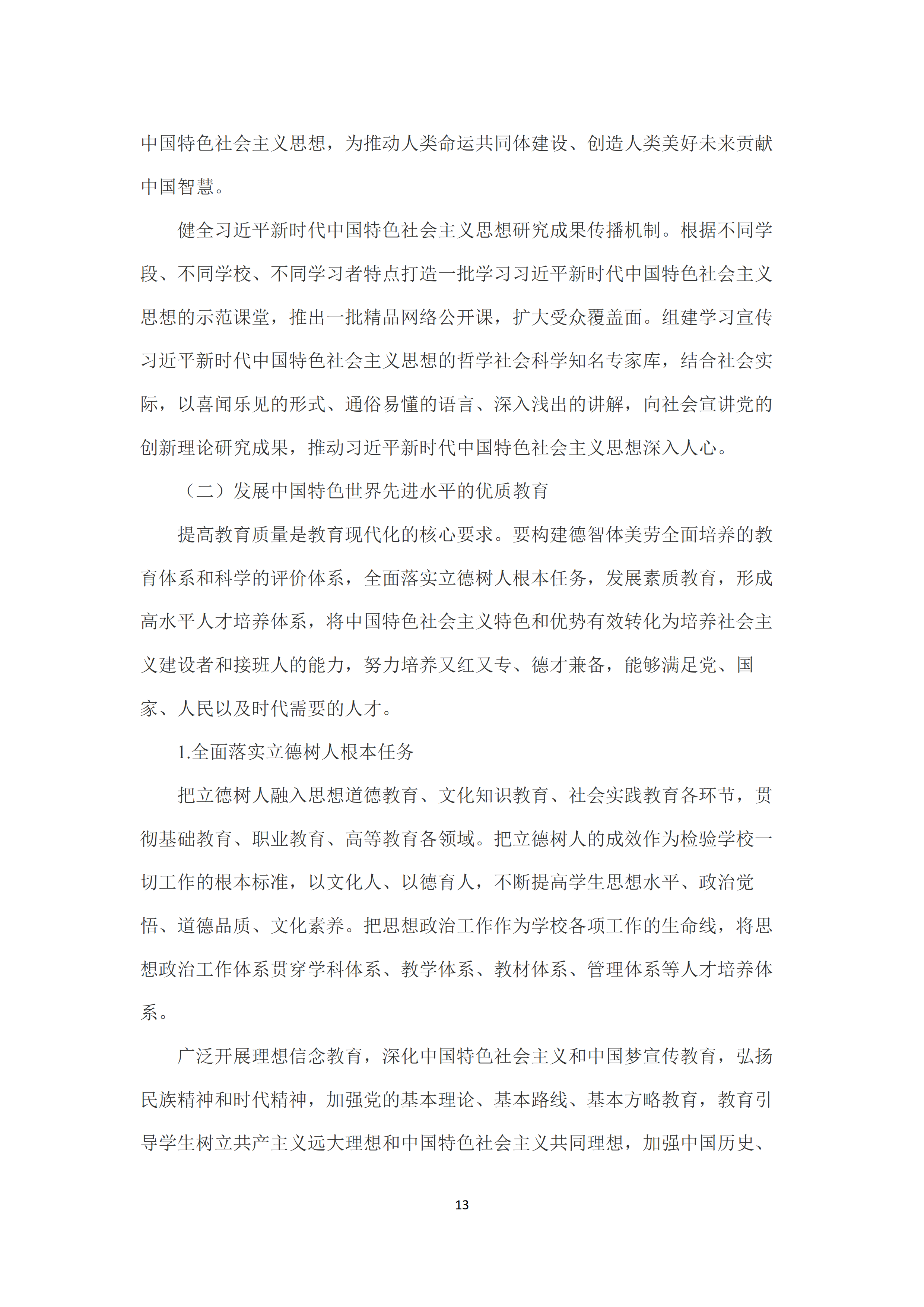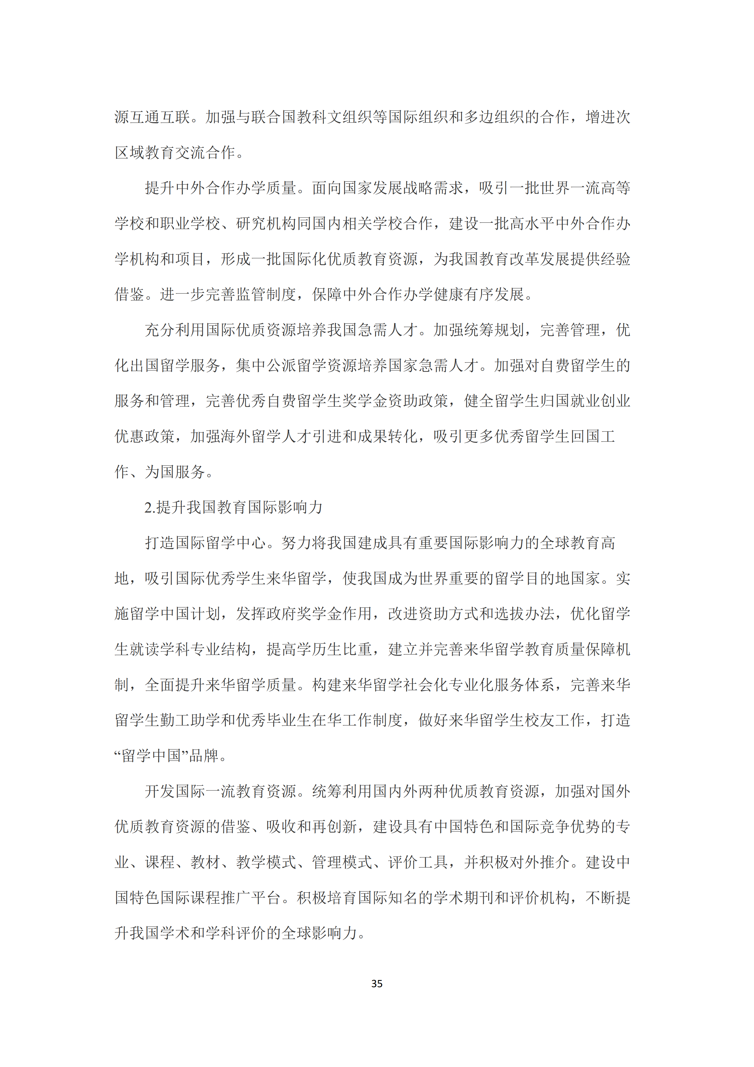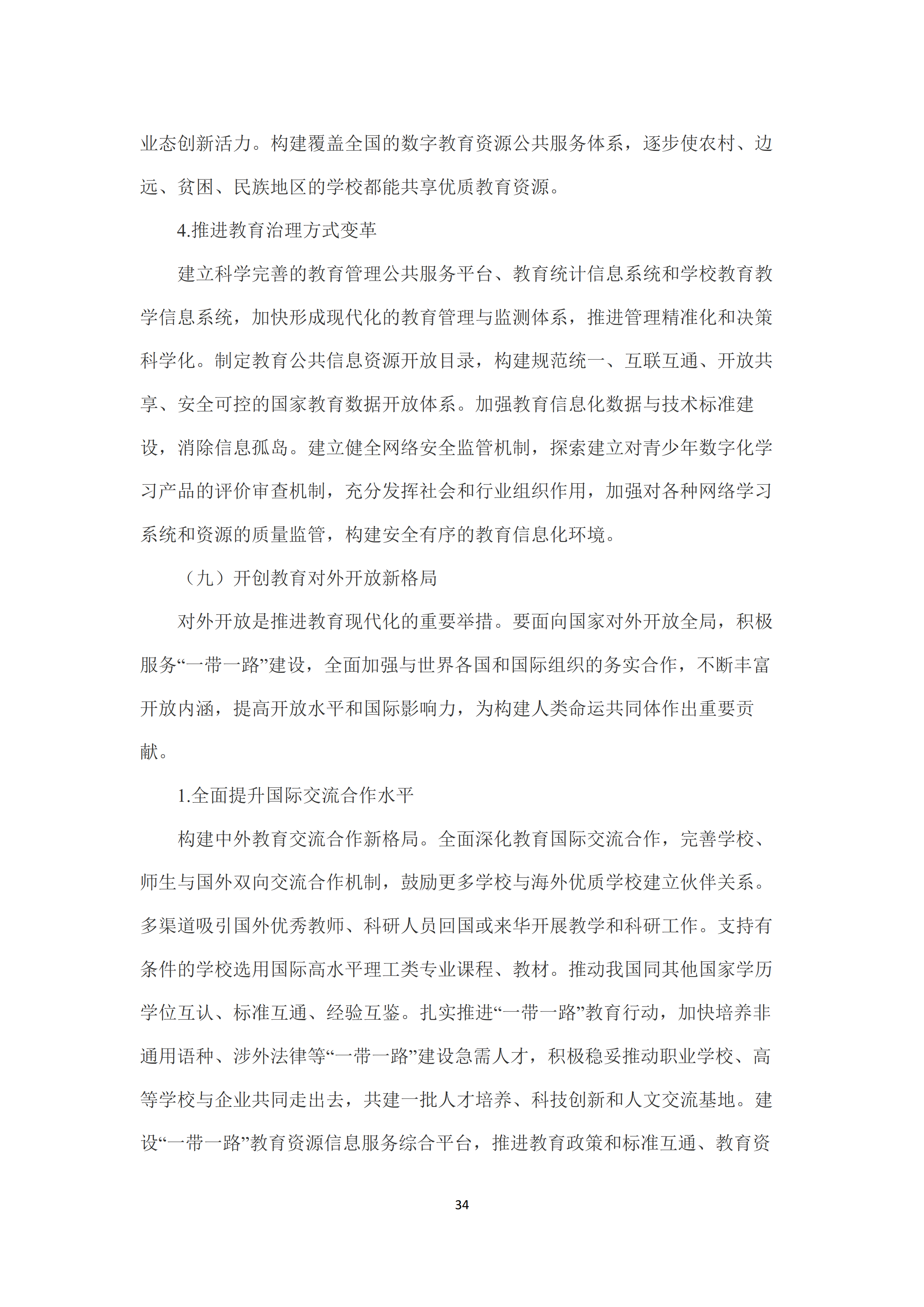 九是开创教育对外开放新格局〰️。全面提升国际交流合作水平🔋🍍,推动我国同其他国家学历学位互认、标准互通👩🏼🎨、经验互鉴🤲🏿。扎实推进“一带一路”教育行动。加强与联合国教科文组织等国际组织和多边组织的合作。提升中外合作办学质量。优化出国留学服务。实施留学中国计划,建立并完善来华留学教育质量保障机制,全面提升来华留学质量🧑🏽🦰。推进中外高级别人文交流机制建设,拓展人文交流领域,促进中外民心相通和文明交流互鉴👩🏿🌾。促进孔子学院和孔子课堂特色发展。加快建设中国特色海外国际学校。鼓励有条件的职业院校在海外建设“鲁班工坊”🏌🏼♀️。积极参与全球教育治理,深度参与国际教育规则、标准、评价体系的研究制定🫃🏽。推进与国际组织及专业机构的教育交流合作🖲。健全对外教育援助机制。