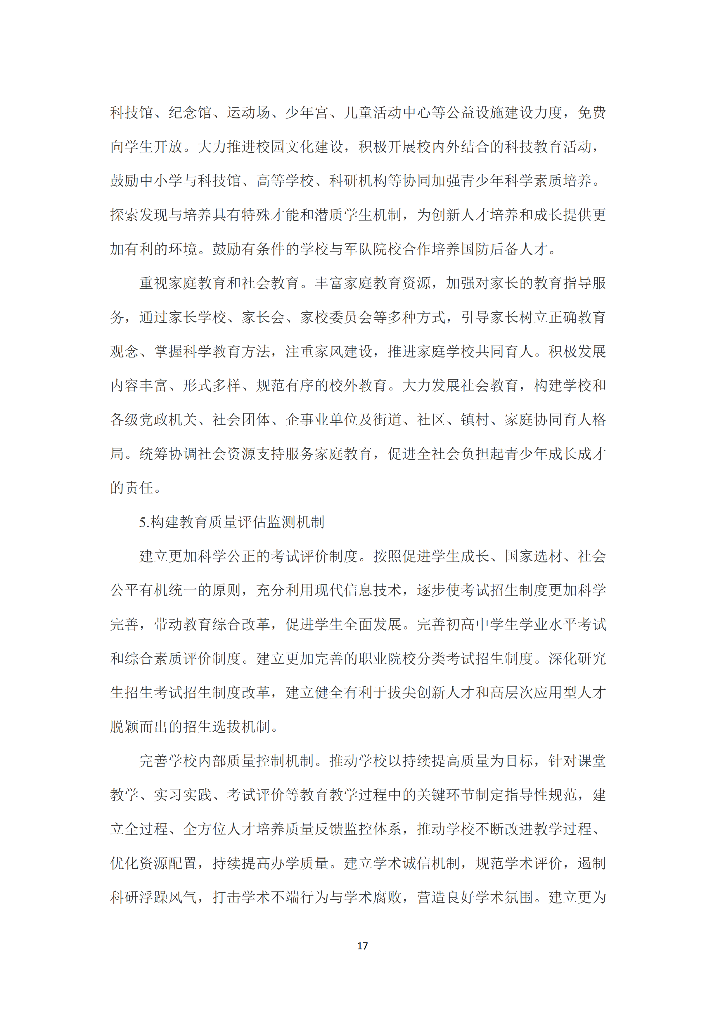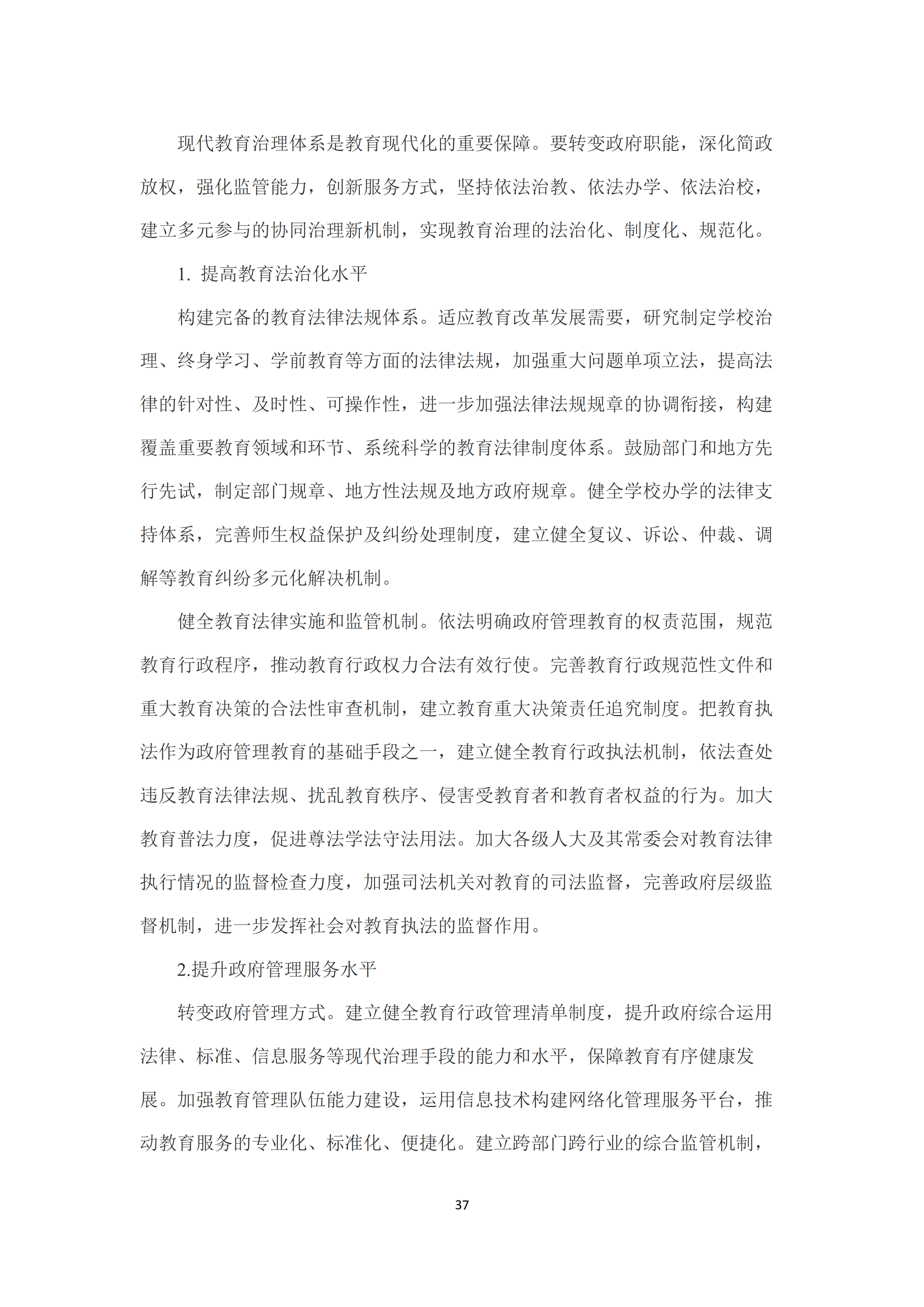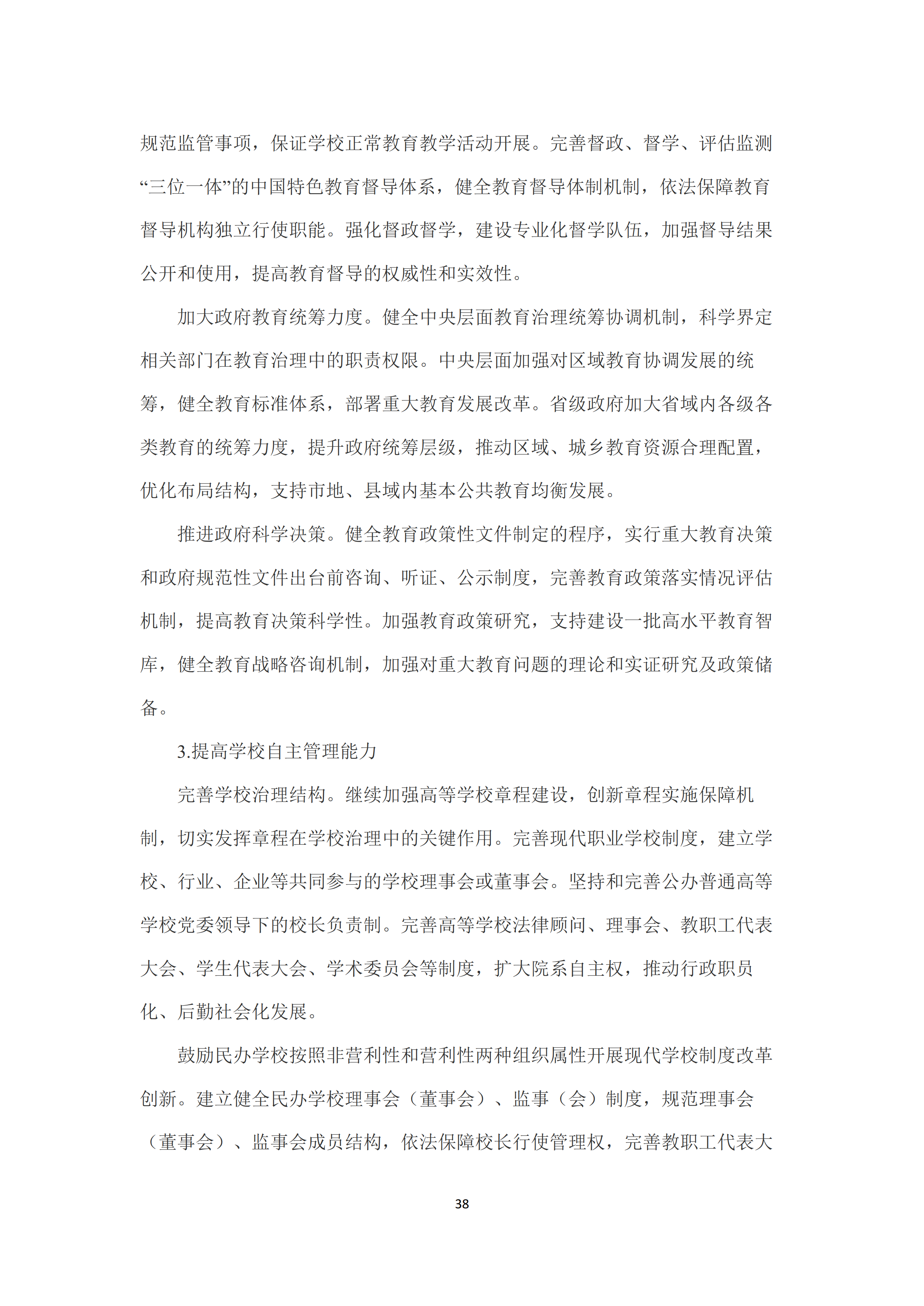 十是推进教育治理体系和治理能力现代化。提高教育法治化水平,构建完备的教育法律法规体系🧞♀️,健全学校办学法律支持体系。健全教育法律实施和监管机制👨🏿⚖️。提升政府管理服务水平,提升政府综合运用法律🤛👷♂️、标准、信息服务等现代治理手段的能力和水平。健全教育督导体制机制,提高教育督导的权威性和实效性。提高学校自主管理能力🦈,完善学校治理结构⛳️,继续加强高等学校章程建设。鼓励民办学校按照非营利性和营利性两种组织属性开展现代学校制度改革创新。推动社会参与教育治理常态化,建立健全社会参与学校管理和教育评价监管机制🎓。