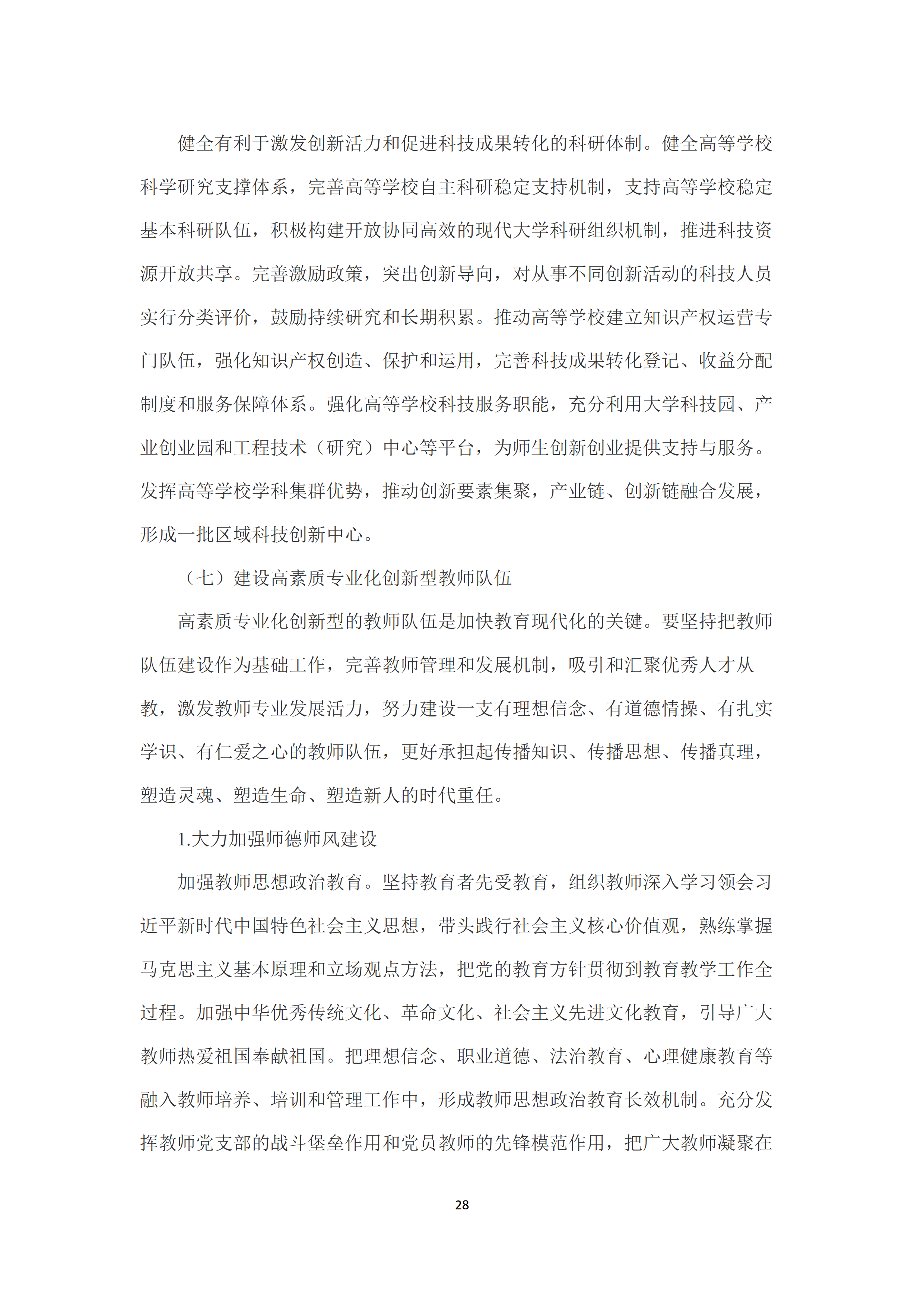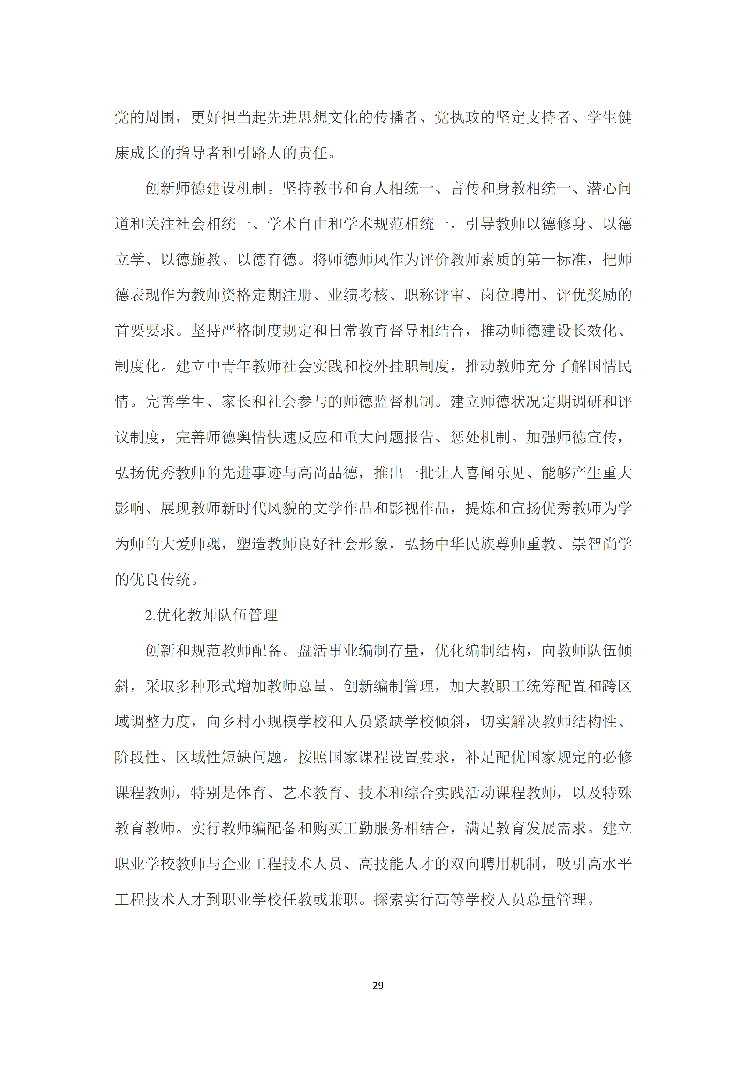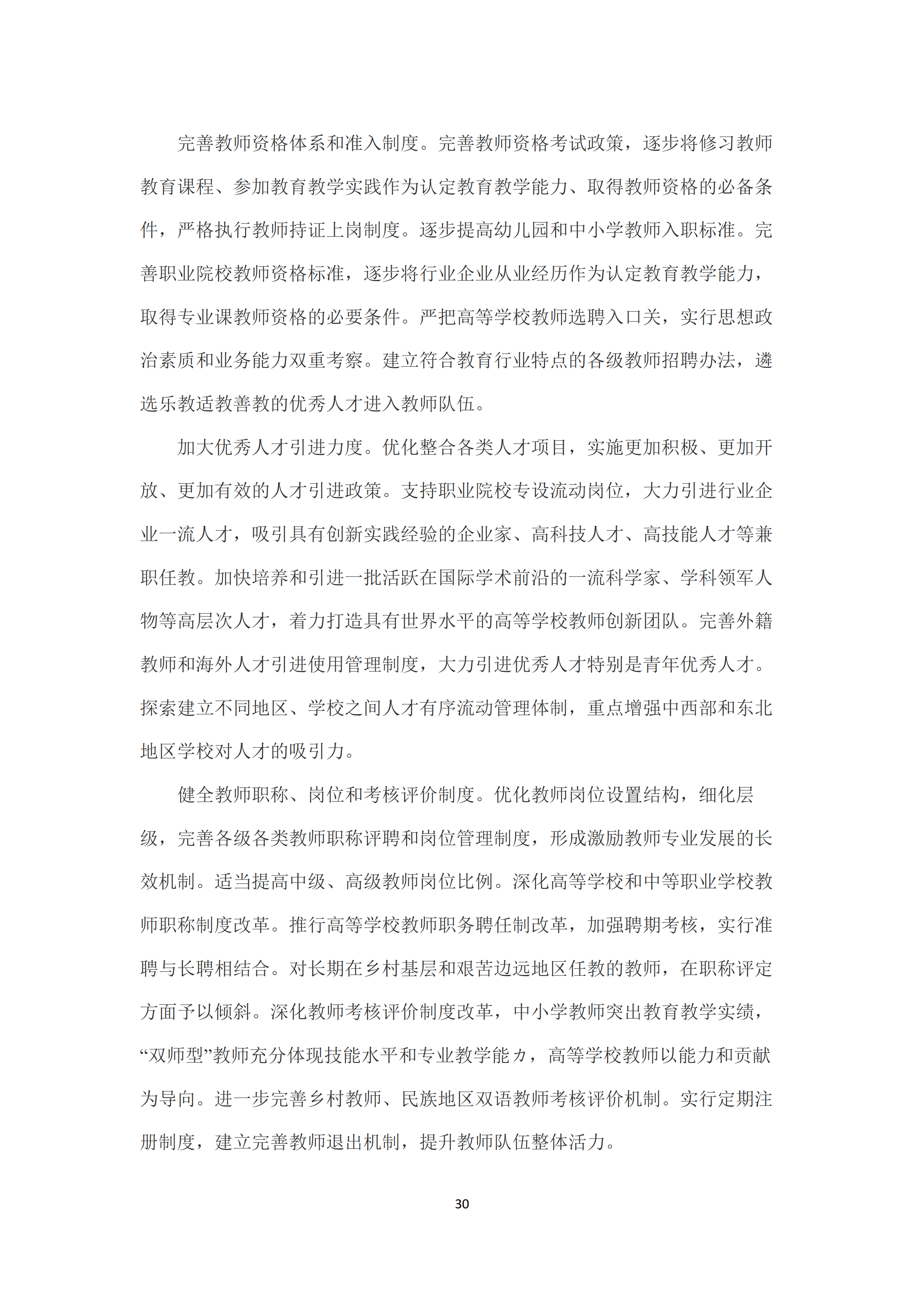 七是建设高素质专业化创新型教师队伍。大力加强师德师风建设,将师德师风作为评价教师素质的第一标准,推动师德建设长效化🧑🏼🦱、制度化🏄🧪。加大教职工统筹配置和跨区域调整力度👶🏻,切实解决教师结构性、阶段性、区域性短缺问题🫃🏽。完善教师资格体系和准入制度😿。健全教师职称、岗位和考核评价制度🙇♀️。培养高素质教师队伍,健全以师范院校为主体💭、高水平非师范院校参与、优质中小学(幼儿园)为实践基地的开放、协同、联动的中国特色教师教育体系。强化职前教师培养和职后教师发展的有机衔接🐖。夯实教师专业发展体系,推动教师终身学习和专业自主发展。提高教师社会地位,完善教师待遇保障制度👲🏼,健全中小学教师工资长效联动机制,全面落实集中连片特困地区生活补助政策。加大教师表彰力度,努力提高教师政治地位👴🏿、社会地位、职业地位🧑🏻🍳。