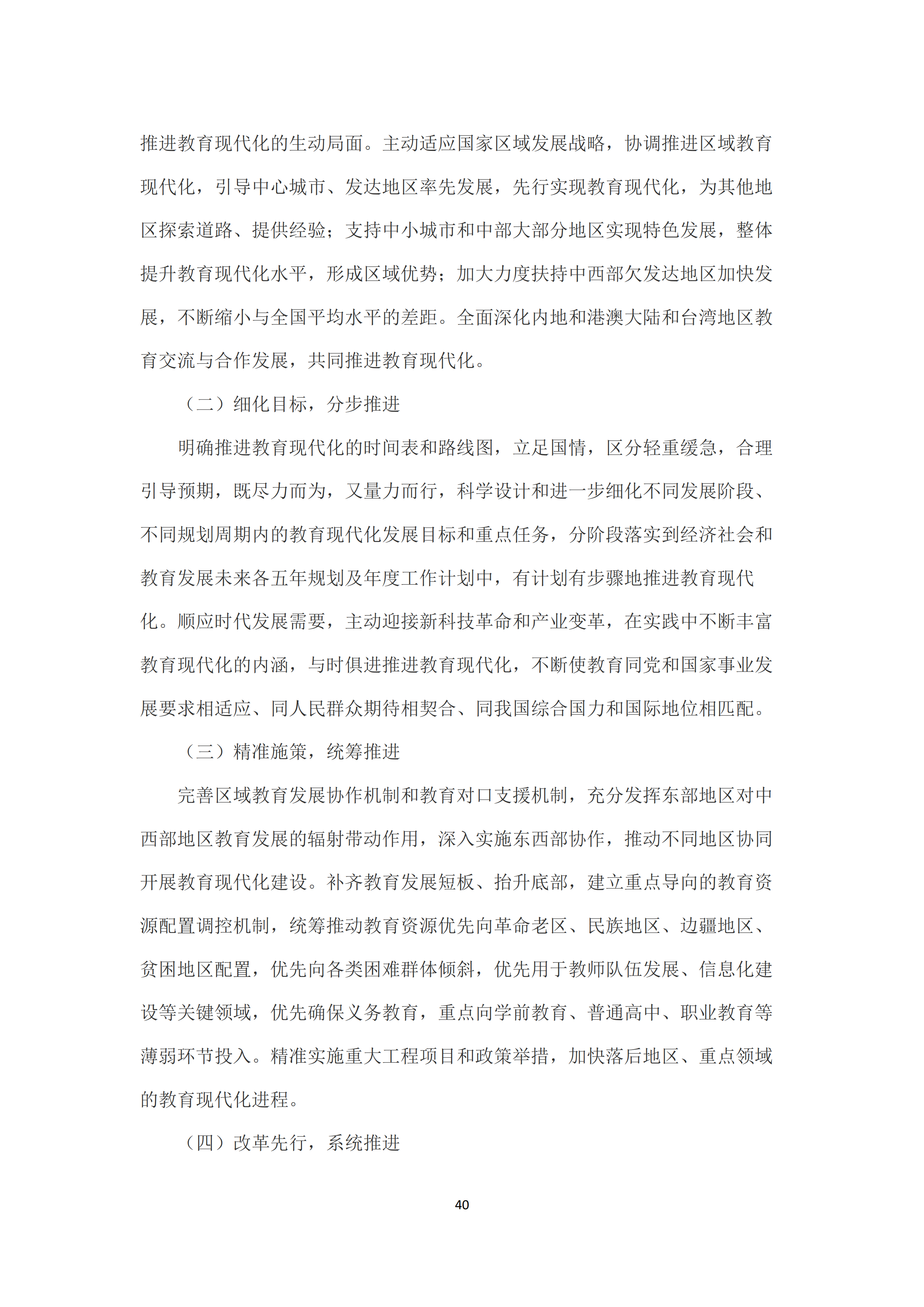 《中国教育现代化2035》明确了实现教育现代化的实施路径:一是总体规划,分区推进。在国家教育现代化总体规划框架下,推动各地从实际出发,制定本地区教育现代化规划,形成一地一案、分区推进教育现代化的生动局面☎️。二是细化目标,分步推进。科学设计和进一步细化不同发展阶段、不同规划周期内的教育现代化发展目标和重点任务☢️,有计划有步骤地推进教育现代化。三是精准施策⚙️,统筹推进。完善区域教育发展协作机制和教育对口支援机制,深入实施东西部协作🚫🔉,推动不同地区协同推进教育现代化建设。四是改革先行,系统推进🕢。充分发挥基层特别是各级各类学校的积极性和创造性💹👁,鼓励大胆探索、积极改革创新,形成充满活力🤹🏽♀️🧏🏽、富有效率✒️、更加开放🙆🏻♀️🙇🏼♂️、有利于高质量发展的教育体制机制🙅🏿♀️。