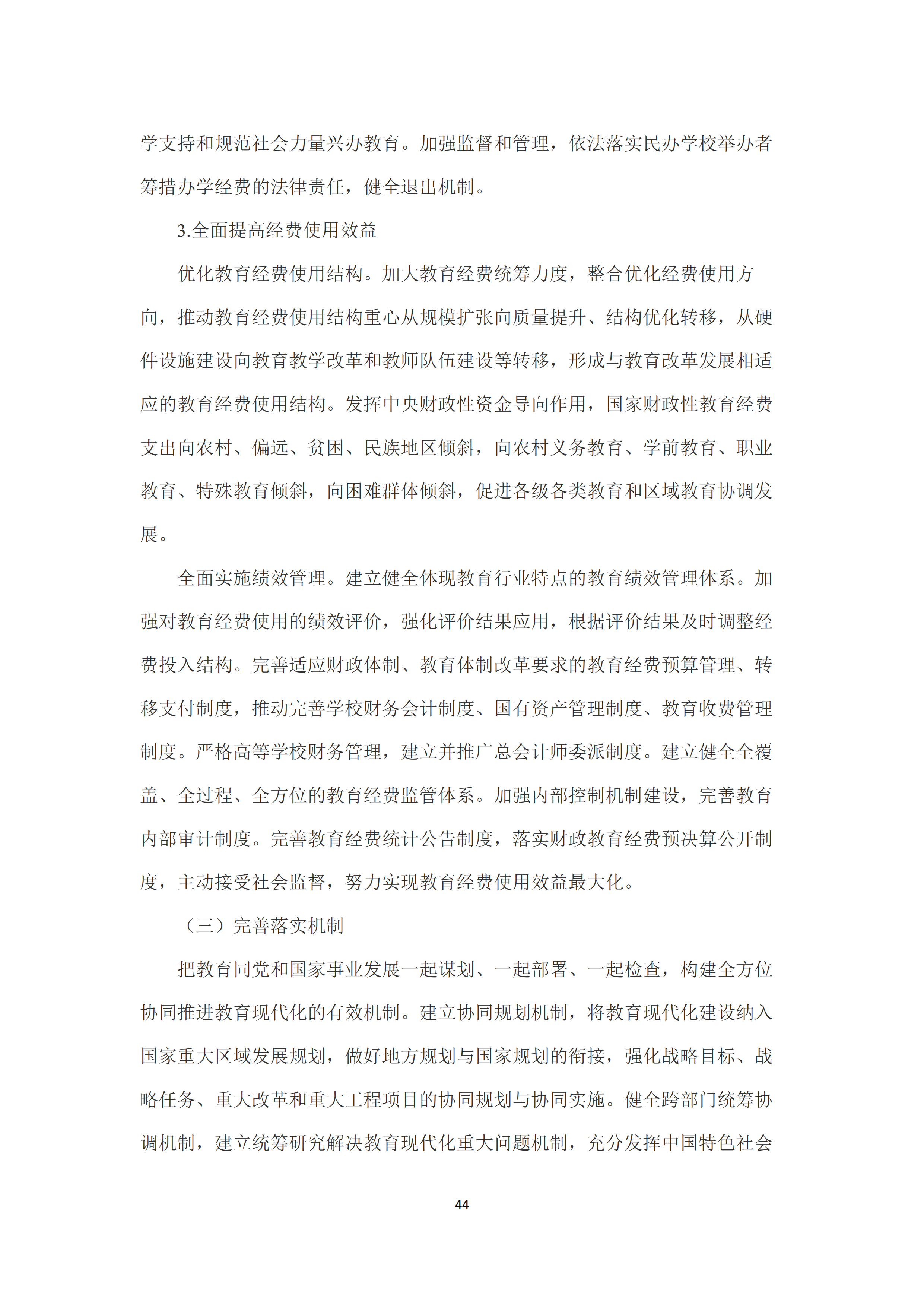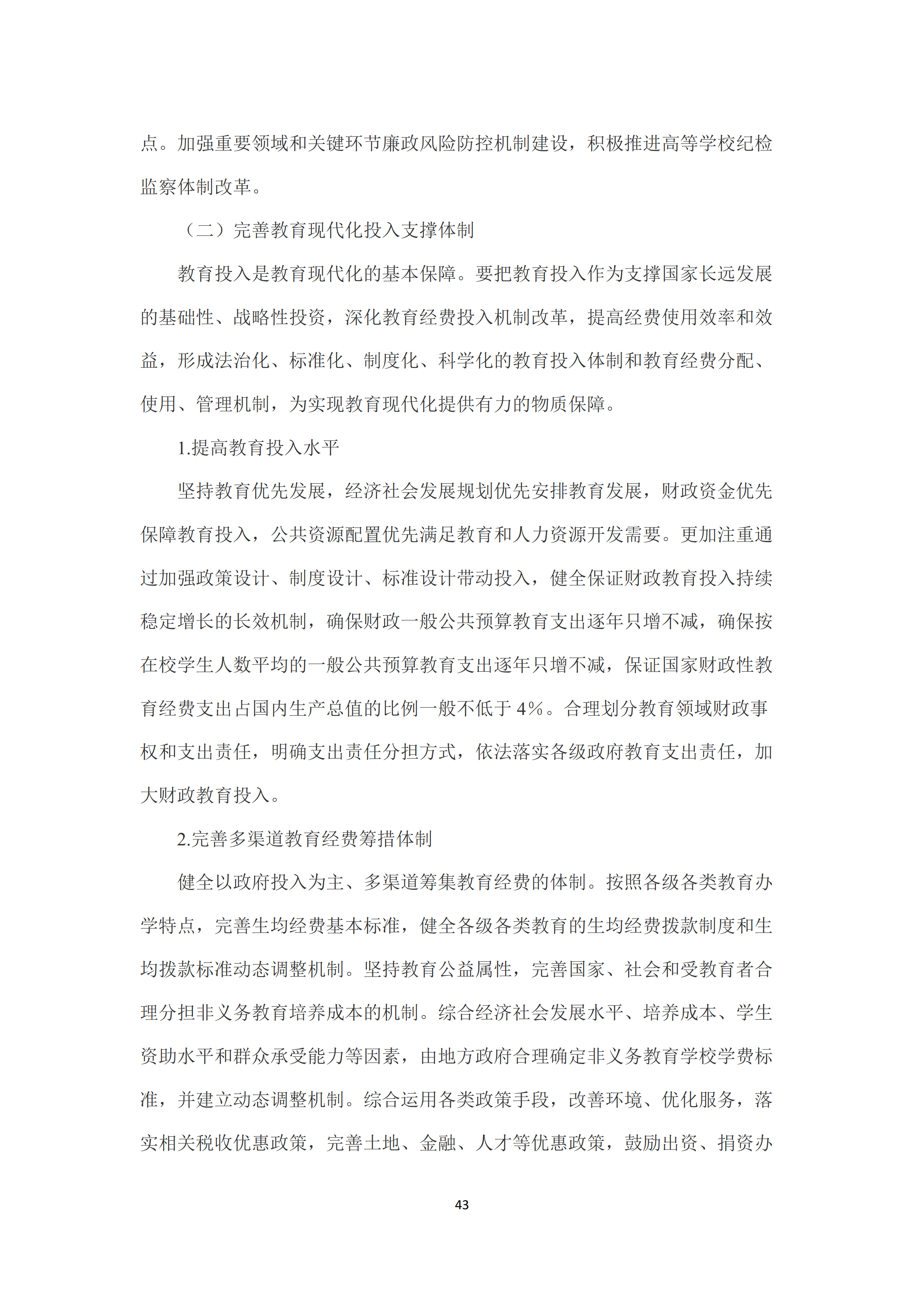 二是完善教育现代化投入支撑体制。健全保证财政教育投入持续稳定增长的长效机制,确保财政一般公共预算教育支出逐年只增不减🙎♀️,确保按在校学生人数平均的一般公共预算教育支出逐年只增不减👨🏿🦳,保证国家财政性教育经费支出占国内生产总值的比例一般不低于4%。依法落实各级政府教育支出责任,完善多渠道教育经费筹措体制,完善国家、社会和受教育者合理分担非义务教育培养成本的机制,支持和规范社会力量兴办教育🐣。优化教育经费使用结构,全面实施绩效管理,建立健全全覆盖全过程全方位的教育经费监管体系🧘🏼♂️,全面提高经费使用效益。