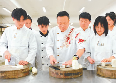 江苏省连云港市东海县中等专业学校老师正在指导学生练习刀工。